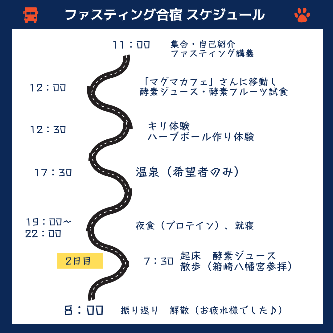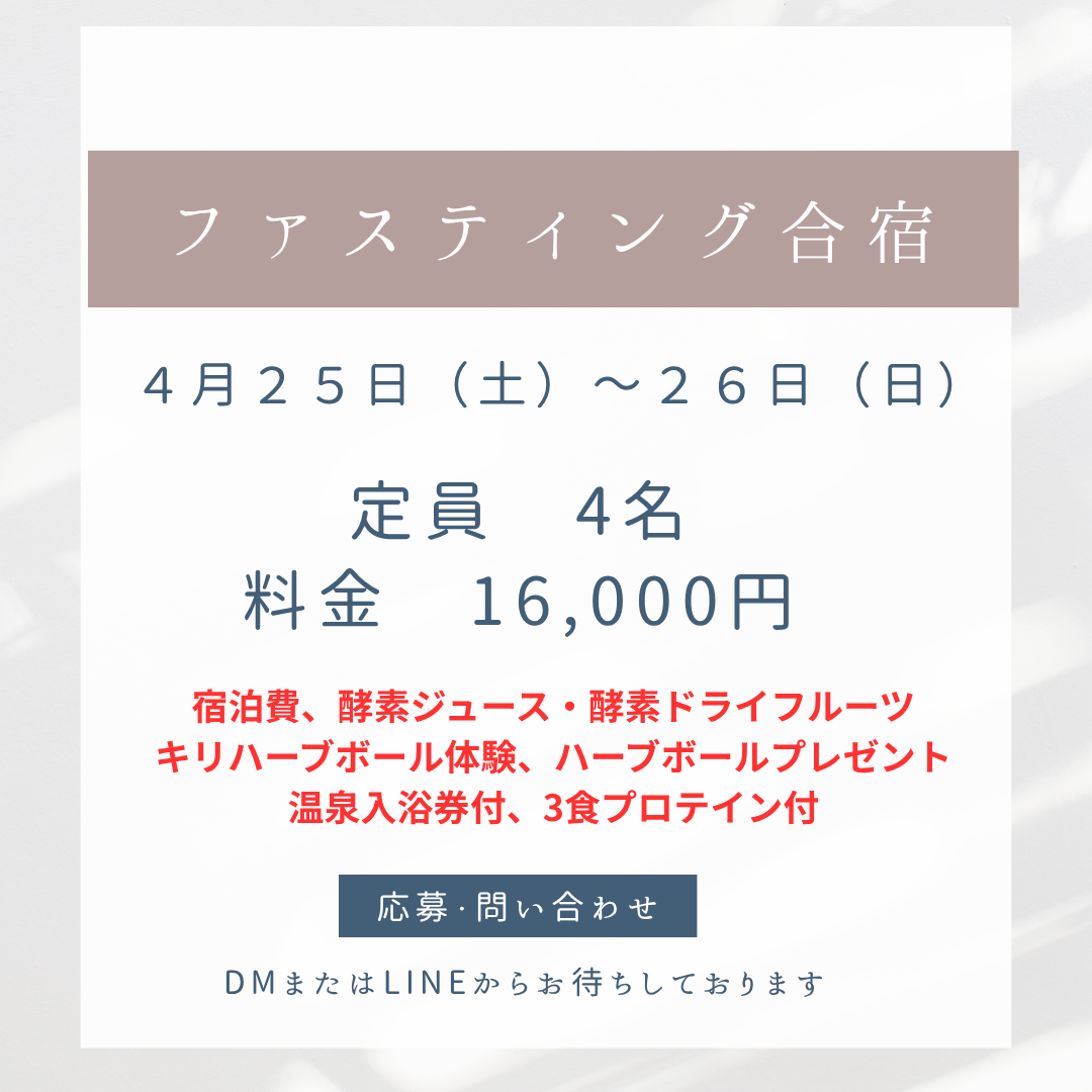 初心者でも参加しやすいように柔道整復師(国家資格)を持った僕が監視の元、しっかりと合宿を行います。ファスティング(断食)の知識はもちろん体のお話、心のお話など幅広く勉強してきましたので、そういったこともお伝えし合宿終了後にも為になっていただければ幸いです。